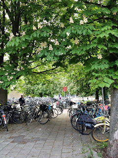 This is the bike parking at the train station near our hotel. People don't lock their bikes to anything, they simply lock the wheel to the frame, because anyone carrying a bike whose wheels are chained is a giveaway that it's been stolen.